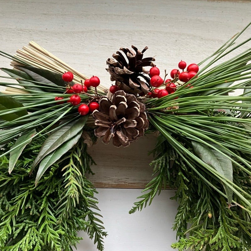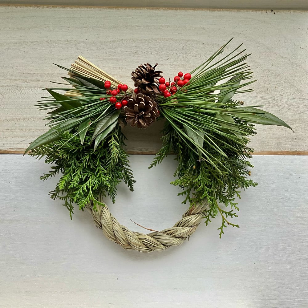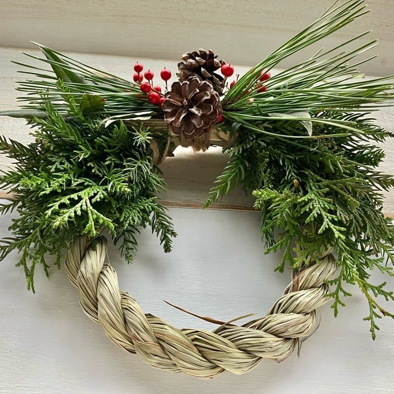 フレッシュなスギやヒノキで作成したしめ縄リースです。
