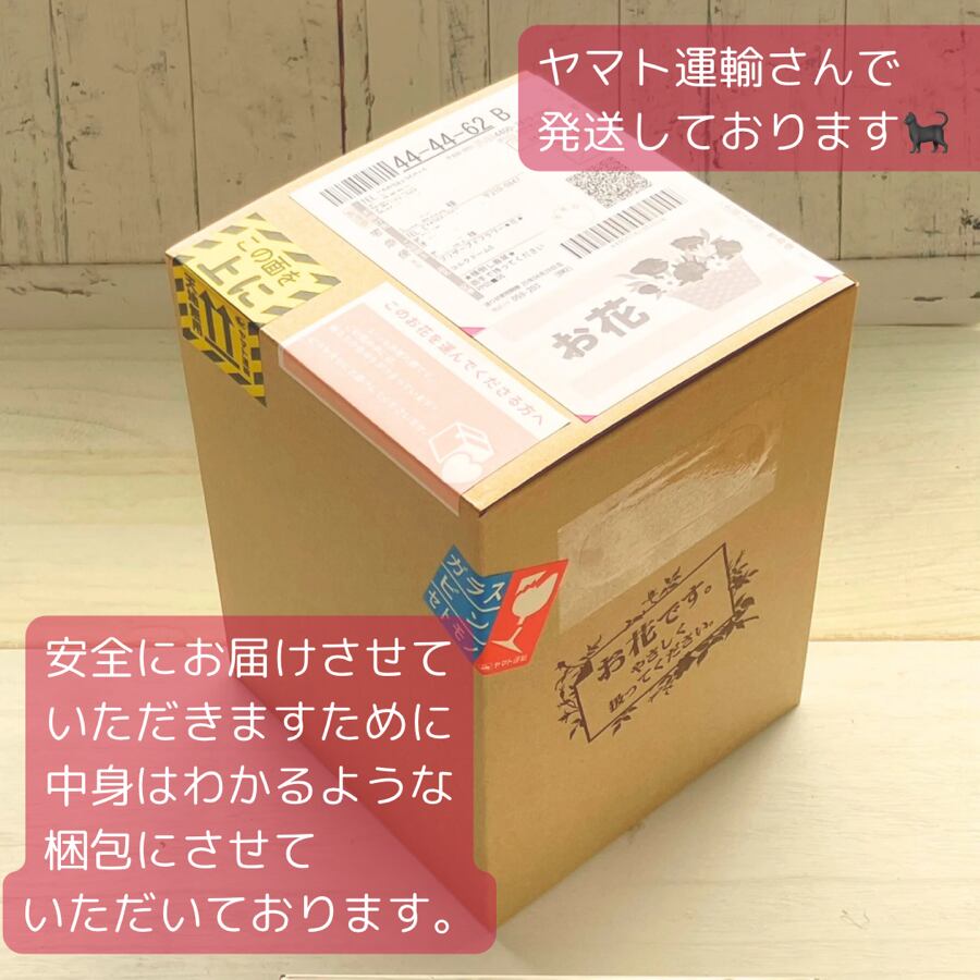 お花の特性上、移送中に花びらが取れたり、葉こぼれなどある場合がございますので、ご留意くださいませ。