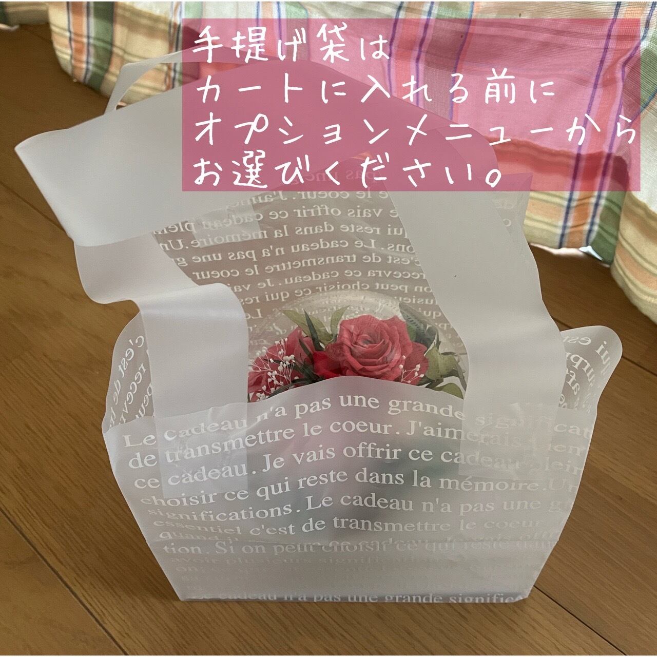 お花は着色料で色を付けてありますので、カーテンや衣服などへの色移りにご注意くださいませ。