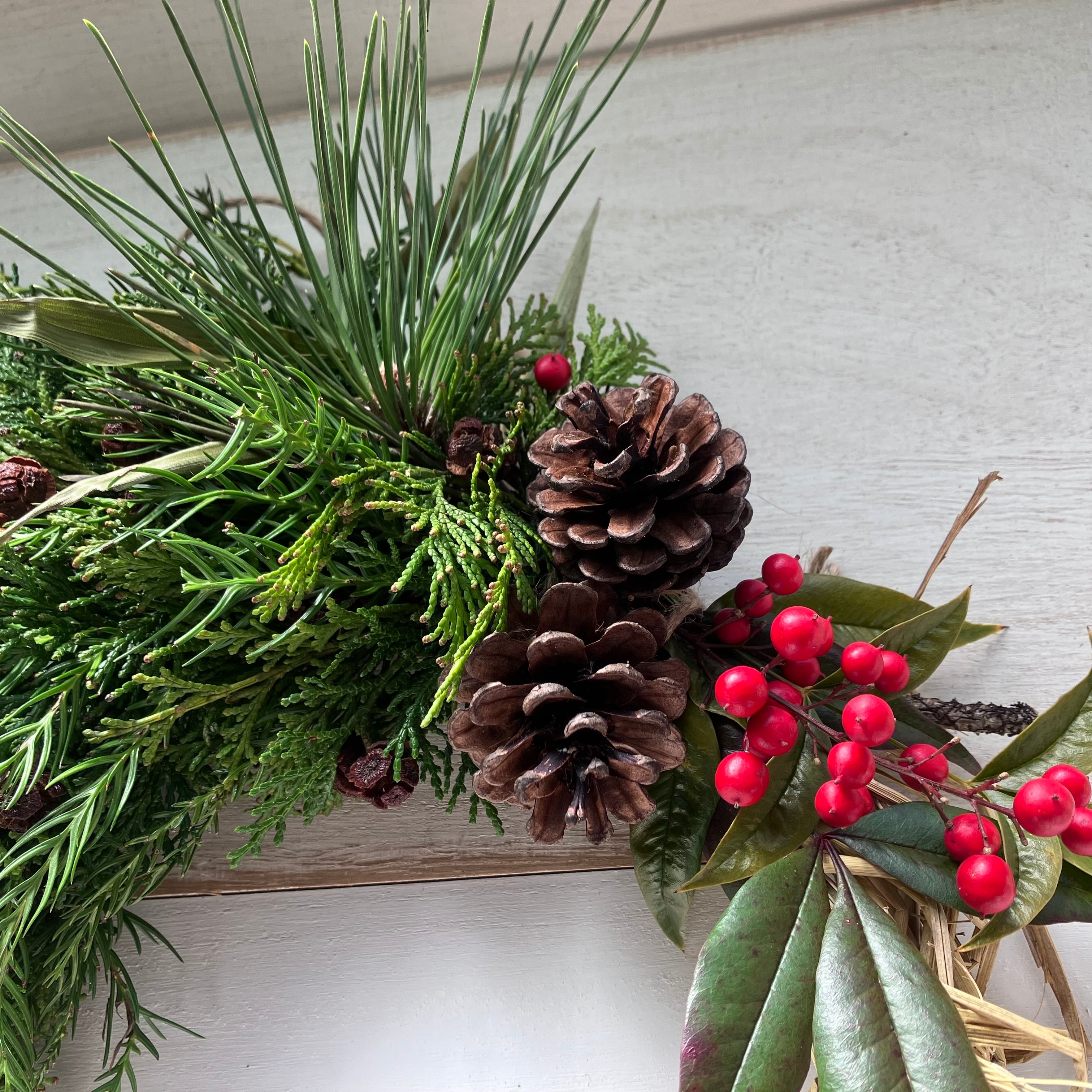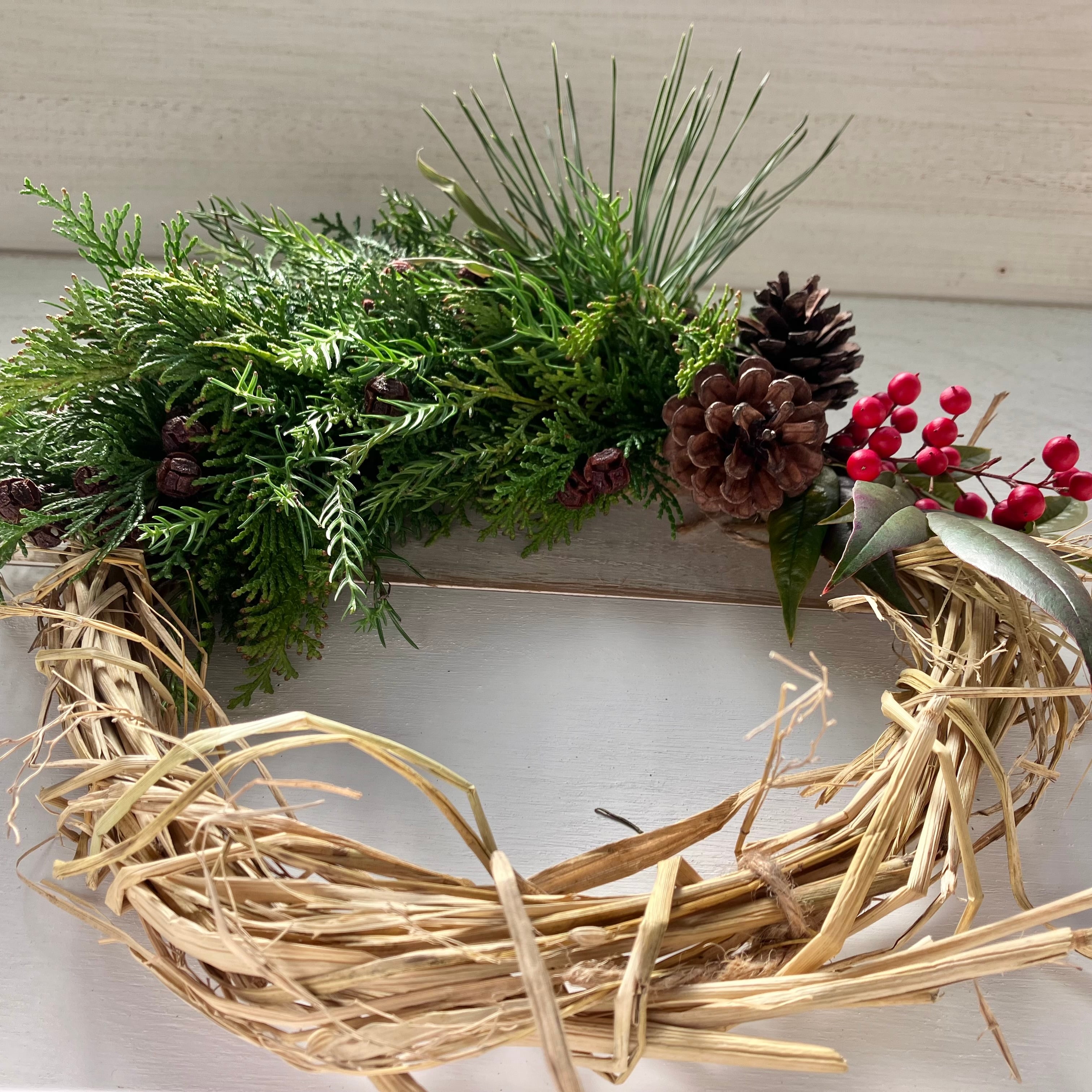 棚田米の稲わらと針葉樹で手づくりのしめ縄リース